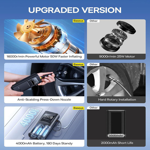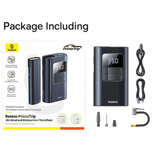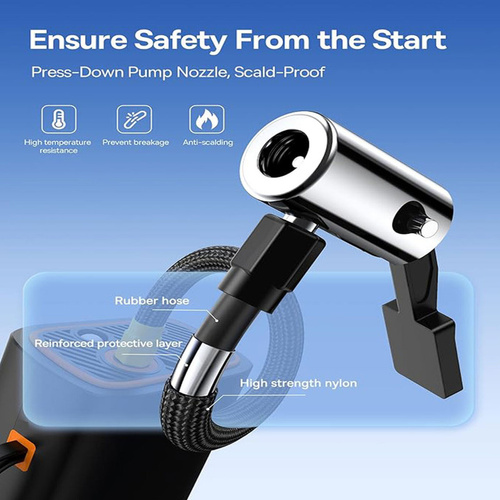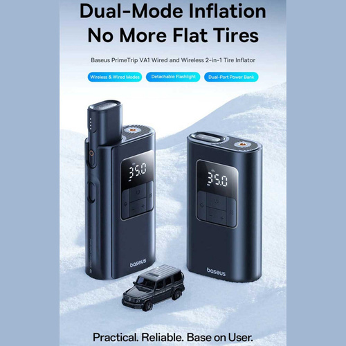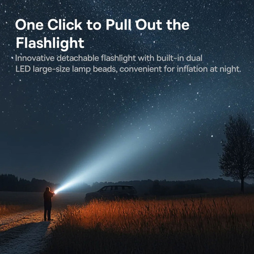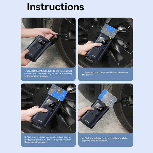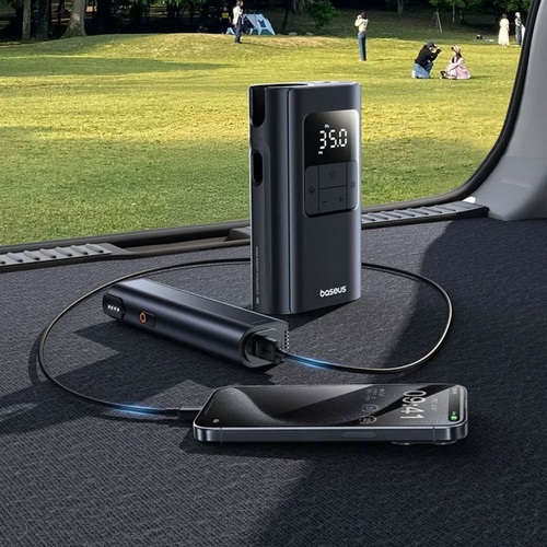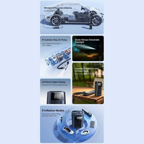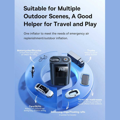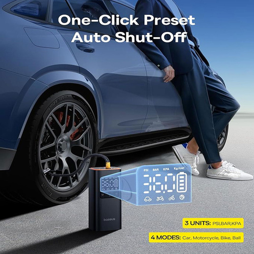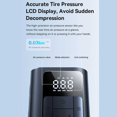 • پمپ باد هوشمند با نمایشگر دیجیتال: فشار باد را دقیق تنظیم کنید و اجازه دهید دستگاه به‌طور خودکار عملیات باد کردن را انجام دهد. پس از رسیدن به فشار مطلوب، به‌صورت خودکار خاموش می‌شود تا از آسیب به لاستیک جلوگیری شود.